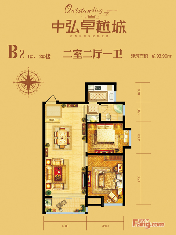 • 中弘卓越城1#、2#樓B2戶型2室2廳1衛(wèi)1廚 93.90㎡