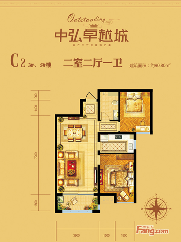 • 中弘卓越城3#、5#樓C2戶型2室2廳1衛(wèi)1廚 90.80㎡