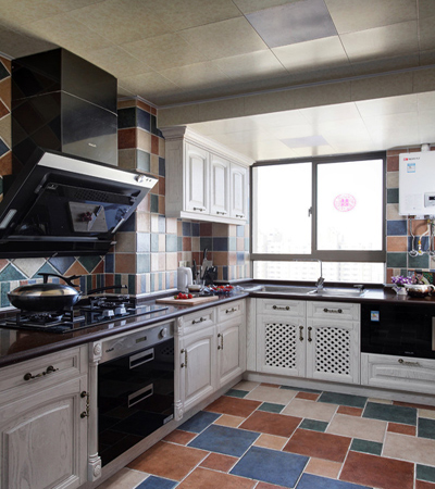 寬敞明亮的廚房。復(fù)古的地中海風(fēng)地磚與櫥柜顯出清爽,側(cè)吸的油煙機(jī)黑色板面時(shí)尚大氣。
