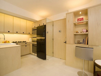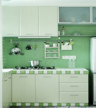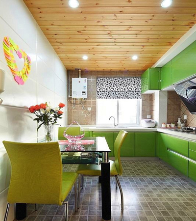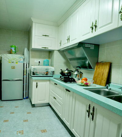 開放式的廚房能節(jié)省不少空間,蘋果綠色很漂亮,桌靠墻擺放 留出的過道恰恰好。