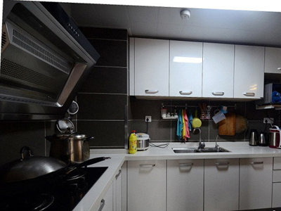 L形的廚房,玻璃的移門。做飯時(shí)還能拉上門簾。