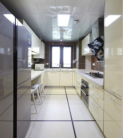 彷佛進(jìn)入虛擬的空間,廚房用的是玻璃移門,長條形的廚房足夠轉(zhuǎn)身操作就好,簡約得體又實(shí)用。