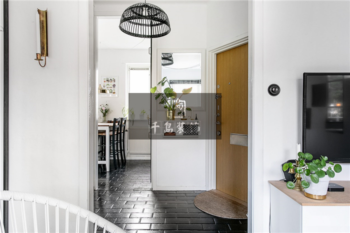 浴室在餐廳與客廳之間,為了避免中間的通道過于單調(diào),屋主在頂部設計了一盞鐵藝吊燈,寬大的燈罩搭配鏤空的線條,能夠恰到好處地充盈空間,又不會顯得過于笨重。純黑的色澤與黑色磚面相互映照,又與白色墻面相互對比,無處不產(chǎn)生碰撞的美感。
