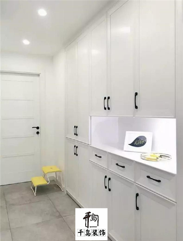 玄關(guān)的鞋柜如果直接擺個鞋柜,頂部空間就要浪費掉,對于鞋子較多的家庭而言似乎有點浪費了;那么這個時候如果通過硬裝的方式,把鞋柜與墻體嵌入安裝在一起的話,就顯得大氣舒適很多了。