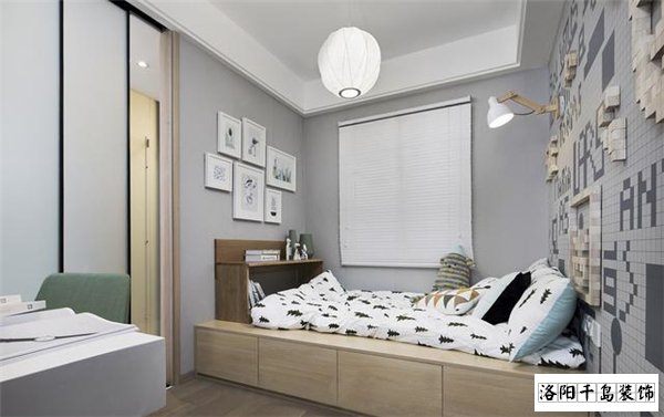 小臥室面積比較小,樣板間采用了時下很流行的榻榻米設計案例,這樣能夠為臥室節(jié)省很多空間,使得臥室顯得更加寬敞一些,另外臥室色彩搭配也是非常棒的,采用了這種淺灰色的格調,在背景墻上還做了造型的設計,顯得非常年輕有活力。
