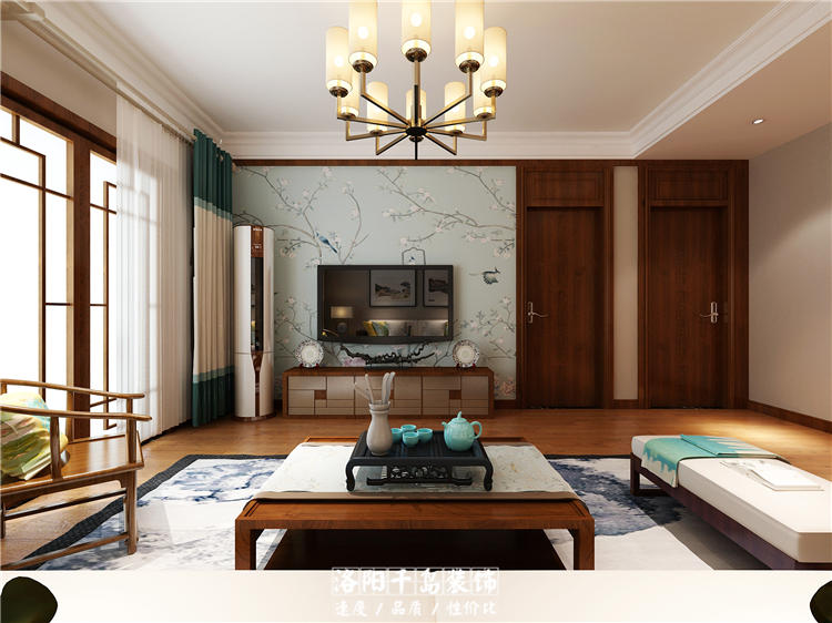 本案例僅過道位置設(shè)計了吊頂,客廳采用疊級石膏板結(jié)合石膏線,沒有過多繁瑣的設(shè)計。電視墻位置較小,通過線條造型,將臥室門融入電視墻中,整體大氣美觀。整體色調(diào)素雅,搭配新中式實木家具,韻味十足。