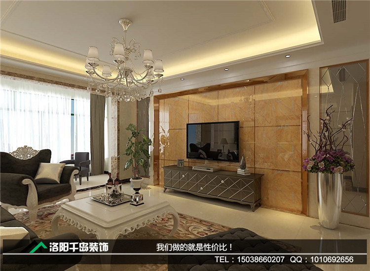 歐式的電視背景墻,選用亮面石材,將大理石被劃分成長方形塊,光滑的質(zhì)地將墻面襯托得優(yōu)雅奢華。