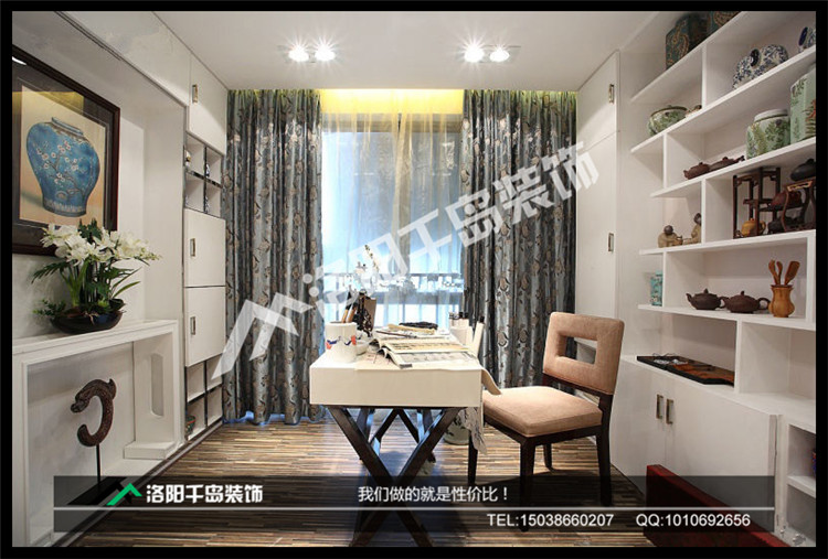 書房,是一個學習、休閑的地方,工作一整天,回到這里,讓躁動的心安靜下來,中式古典裝飾品加上現代化特征明顯的裝修,在這里,整個人都會得到凈化。