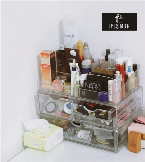 護(hù)膚品和彩妝,常用的都用透明亞克力收納盒放桌上。