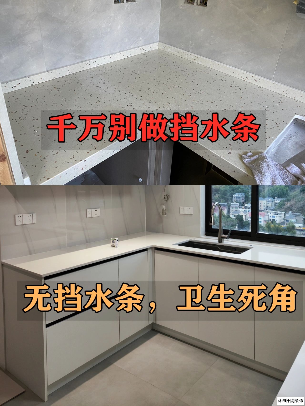 首先,臺(tái)面不要再做這種擋水條了,多兩到膠,時(shí)間久了肯定會(huì)受潮發(fā)黑的,根本清理不干凈。它的作用其實(shí)就是遮墻和柜子之間的縫隙,我們只要在瓦工階段囑咐好工人師傅把墻貼平,像這樣不做擋水條,衛(wèi)生死角少了不說,臺(tái)面又寬兩公分。