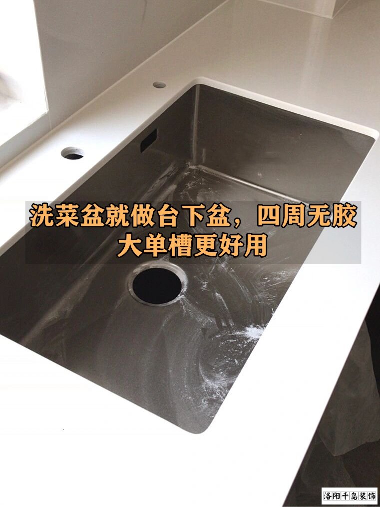 洗菜池就做這種臺(tái)下盆,四周沒有膠,不會(huì)發(fā)霉才更好做衛(wèi)生,不過一定要記得要做這種大單槽,洗個(gè)鍋啊什么的都沒問題,要是想像雙槽一樣分開洗,你就搭配個(gè)瀝水籃就好了。