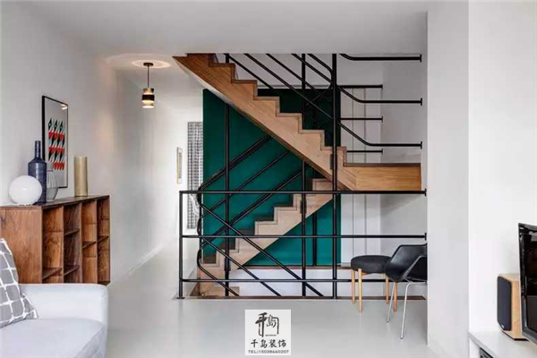 采光條件較差的樓梯空間,墻面被刷上了青綠色,進(jìn)一步凸顯出棕木色樓梯的原木質(zhì)感,并在黑色扶手與白色墻面之間起到了過(guò)渡作用。美美的墻邊柜空間也少不了小清新色彩裝飾畫的點(diǎn)綴。