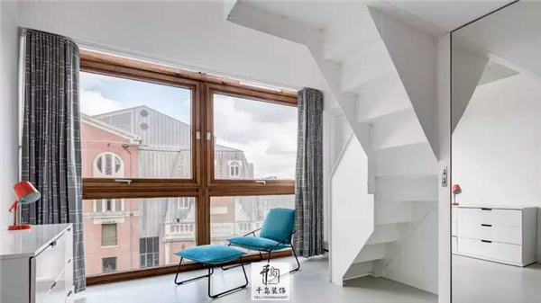 在二樓的落地窗旁,如此充滿陽(yáng)光與詩(shī)意的角落,當(dāng)然得放上舒適的躺椅,愜意得享受窗外景色和陽(yáng)光啦!柜子上的臺(tái)燈和躺椅更是組成了紅藍(lán)色彩CP~