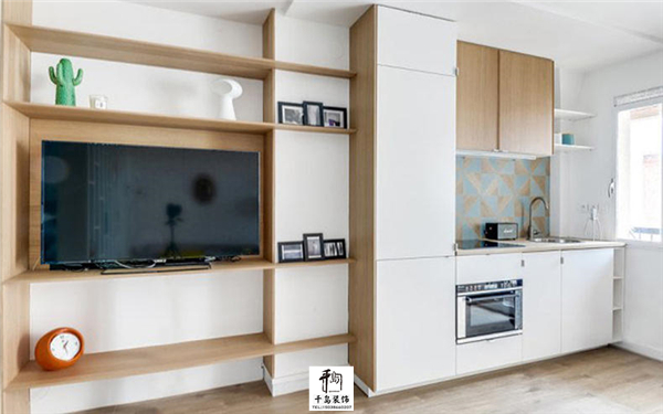 單獨(dú)的看一下這面墻,我覺得這人能夠利用墻壁裝出這樣的效果,也真是夠有才,這面墻壁不僅是電視墻,也是打造了入墻式的櫥柜,中間做了一個(gè)隔斷設(shè)計(jì),小小的櫥柜確是我們的開放式廚房,對(duì)于這種小戶型而言,這樣的設(shè)計(jì)很省空間,而且格局設(shè)計(jì)我覺得給滿分。